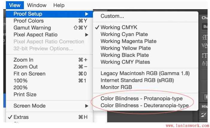 設(shè)計師常用的PS和AI提供了模擬紅色盲和綠色盲的校樣設(shè)置,選擇“視圖—校樣設(shè)置—紅色盲型/綠色盲型”。