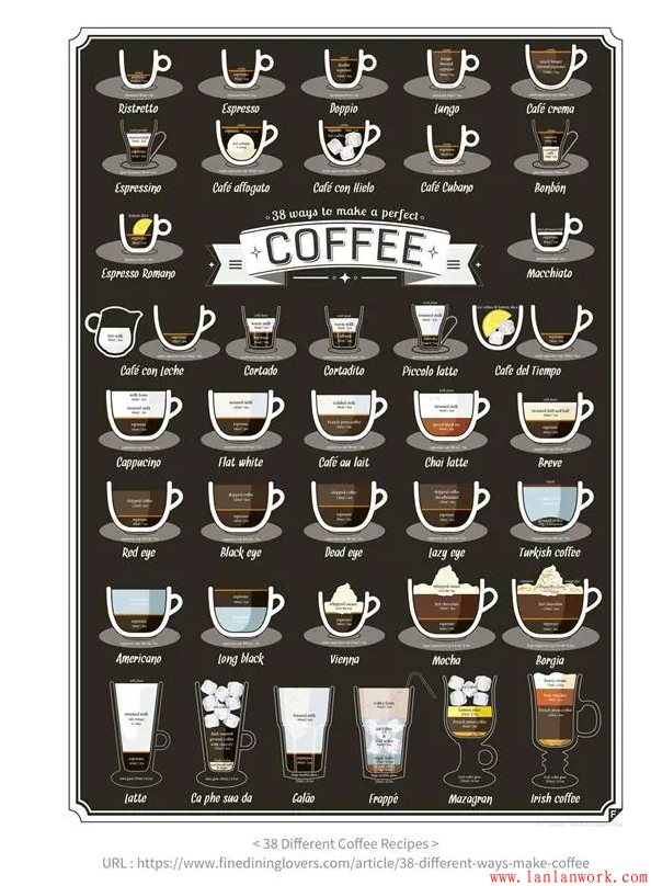文字有時候是一種匱乏的信息傳遞方式,而可視化的方式,則是人類最本源的一種信息傳遞方式,圖解就是將很多無法準確或用語言傳達的內(nèi)容,以生動形象的圖形解釋出來。下圖是一張經(jīng)典的對于咖啡種類圖解,38種咖啡配方,不必要用多余的文字解釋,直接用圖解表示,簡單明了,清晰易懂。