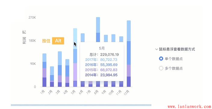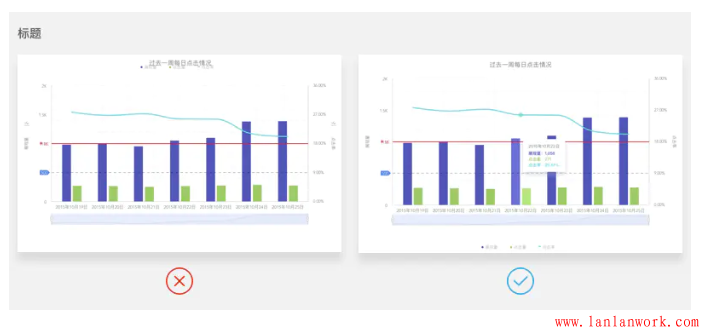 (1)輕量。眾所周知表格是可以承載數(shù)據(jù)的全面性,但將相同的數(shù)據(jù)用可視化展示時,設(shè)計師總想將所有的信息堆砌在圖表上,顯得圖表非常笨重,因此增加了用戶的思考時間。在此建議明確你圖表類型的特點,將主要信息呈現(xiàn)在圖表上或者分層展示圖表,比如數(shù)據(jù)鉆取功能。