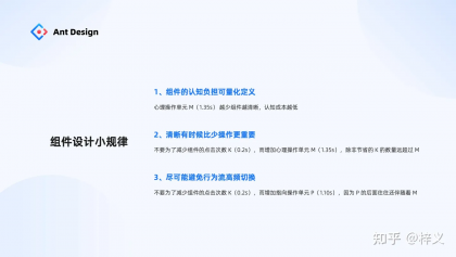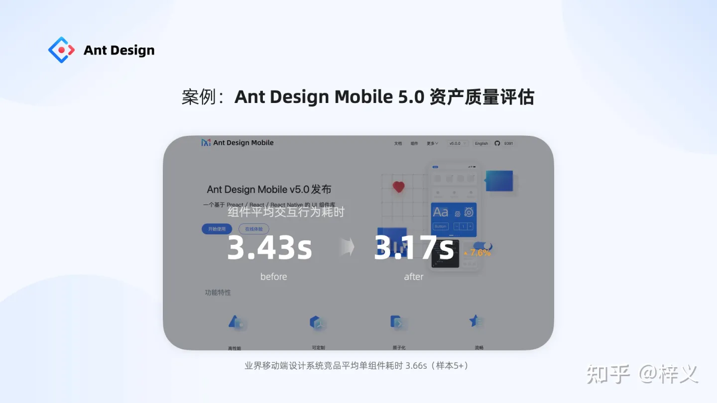 在螞蟻內部,我們還將原規范應用到其它設計系統的建設當中。比如,Ant Design Mobile 5.0 今年引來大版本的更新,從 200+ 的冗余組件收斂成了 68 個通用組件,同時通過評估發現其組件質量也提升了不少,系統中單組件平均交互行為耗時從 3.42 降到了 3.17,高于業界平均。