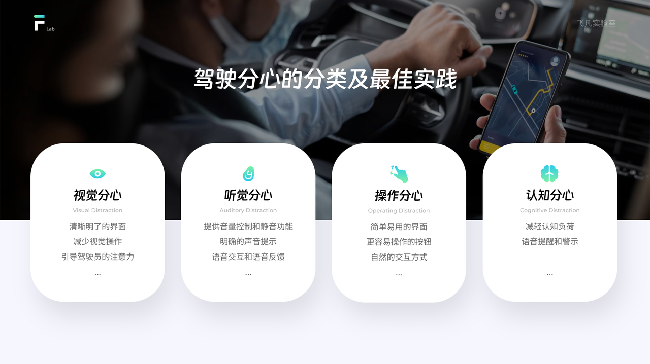 當駕駛員的注意力從道路上轉移到車輛內部或周圍環境時,就會發生視覺分心。例如,看手機、調整收音機或尋找物品等。最佳實踐: