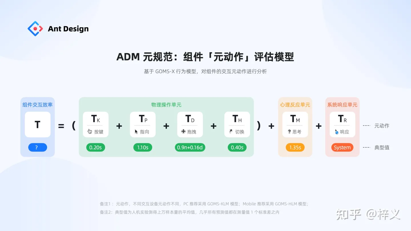 ADM 元規范的組件評估模式正式基于 GOMS 人機交互模型演變而來。GOMS 是 1983 年 Card 等人在《The Psychology of Huamn Computer Interaction》首次提出的一種交互建模方法,它的核心理念是將用戶與界面交互行為拆解為行為元動作,無需真實用戶介入就能預測交互行為的序列,評估交互的質量。