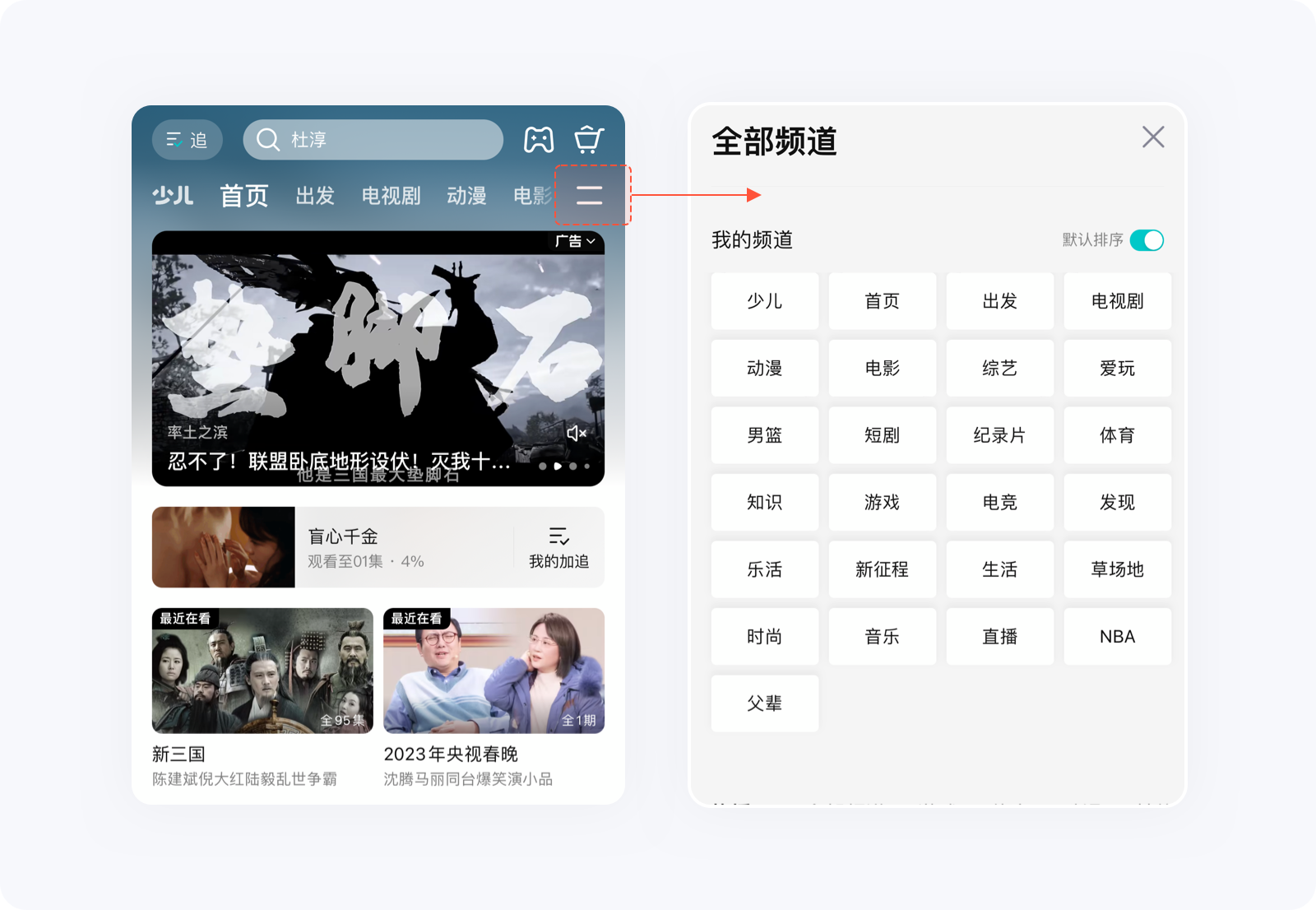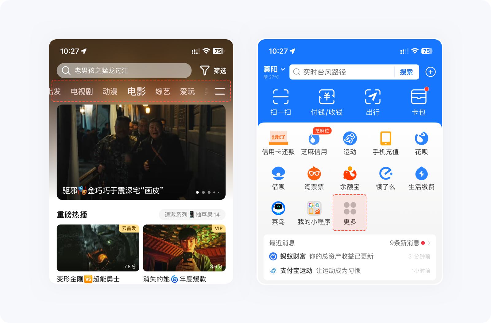 如果大量的選項(xiàng)無(wú)法減少,可將重要選項(xiàng)靠前,將其他的隱藏起來(lái),方便用戶決策及降低失誤操作的概率。例如騰訊視頻頂部分類后面的更多圖標(biāo)、支付寶首頁(yè)金剛區(qū)的更多入口,點(diǎn)開后就會(huì)發(fā)現(xiàn),里面隱藏了非常多的功能,這樣做能減少用戶認(rèn)知負(fù)荷,提高信息篩選的效率。