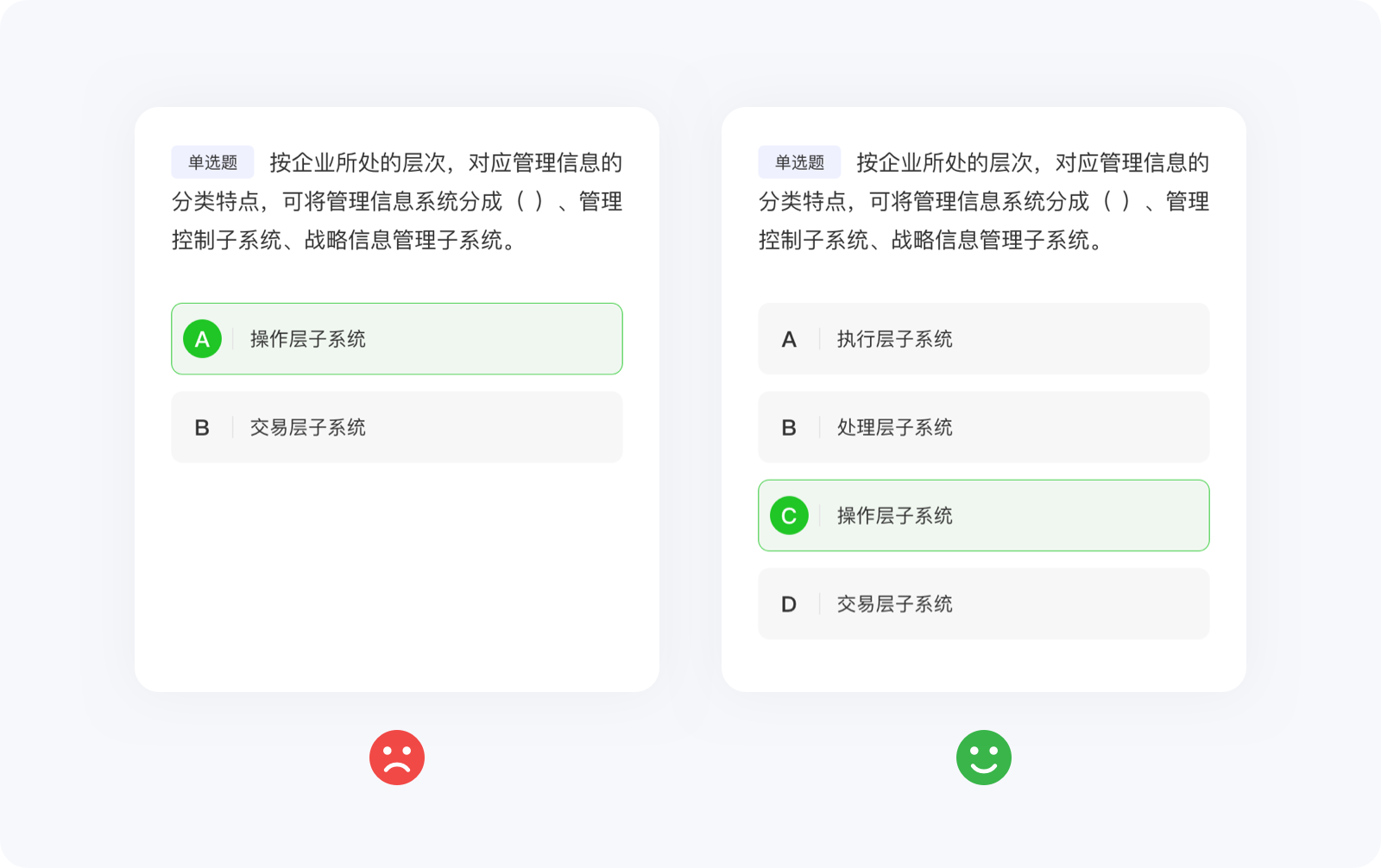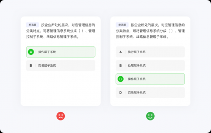 任何定律都有其自身的使用局限,所以也不要極度推崇希克定律而簡(jiǎn)化到抽象的地步。大部分情況下,希克定律都是用在可交互界面中的元素,對(duì)于那些需要高度搜索、閱讀或?qū)W習(xí)刷題類的功能并不適用,因?yàn)樵O(shè)計(jì)師只能決定信息呈現(xiàn)的視覺效果,并不能決定內(nèi)容的質(zhì)量、類型與數(shù)量。例如,刷題類應(yīng)用,面對(duì)海量的選擇題,希克定律雖然失去價(jià)值,但并不影響設(shè)計(jì)師結(jié)合其他方法論將界面設(shè)計(jì)的更好,總不能強(qiáng)行使用希克定律,將選擇題刪減到只剩兩個(gè)(變成判斷題)選項(xiàng)吧。