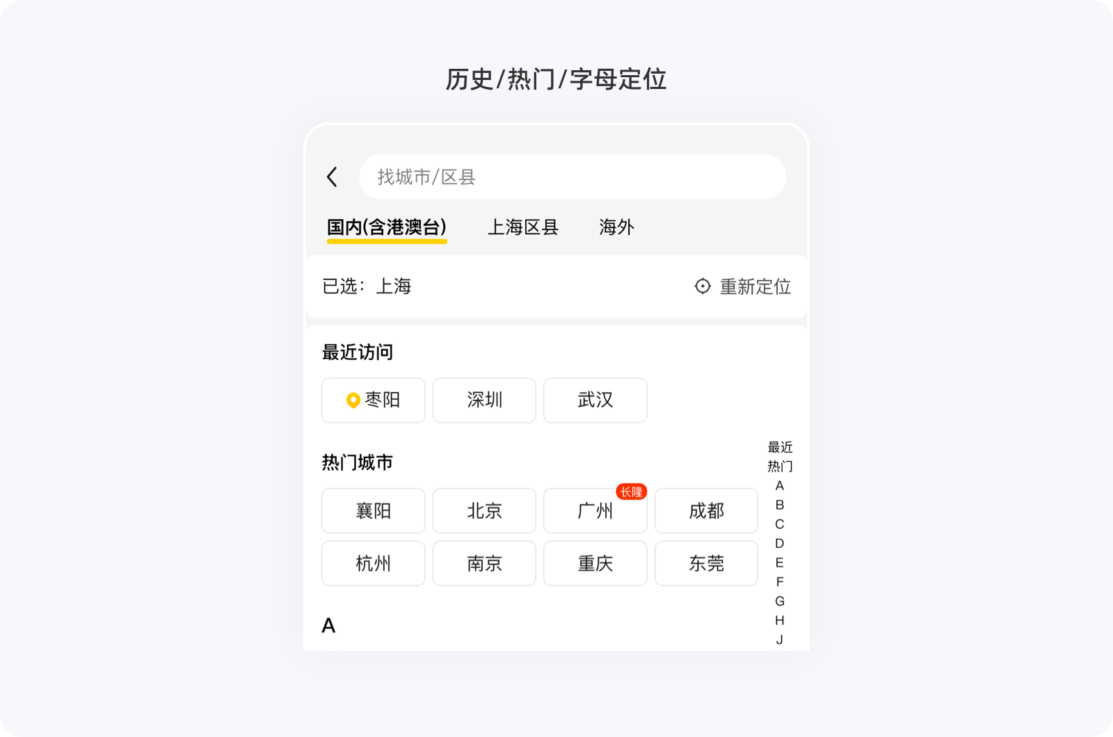 另外,我們?cè)谶x擇地址時(shí),如果將所有城市一股腦平鋪在界面上,用戶想要選擇自身所需,則需要花費(fèi)大量的時(shí)間。對(duì)城市進(jìn)行了分類分層,以及有了搜索歷史、熱門城市以及右側(cè)的首字母索引后,用戶就能通過(guò)不同維度快速找到想找的城市,選擇效率直線上升。