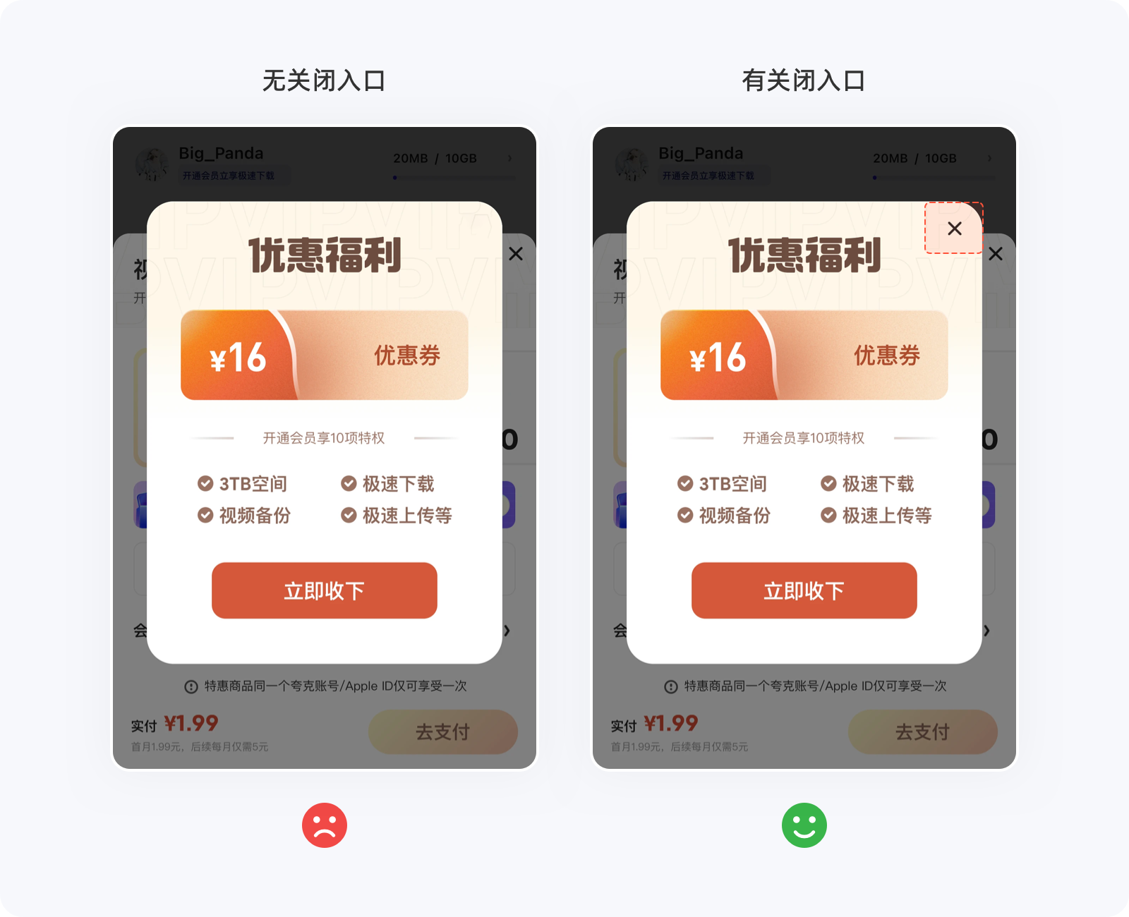 希克定律要做的是通過(guò)減少用戶做決定的時(shí)間,來(lái)提升轉(zhuǎn)化率以及用戶體驗(yàn),但不管在什么情況下,用戶都希望自己還擁有選擇的權(quán)利,如果設(shè)計(jì)師自作聰明的將選項(xiàng)減到只剩一個(gè),就相當(dāng)于告知用戶必須接受,那么用戶就有種被強(qiáng)制、綁架的感覺,只會(huì)存在兩個(gè)結(jié)果:①被你的產(chǎn)品拿捏、②離開你的產(chǎn)品,筆者相信第一種可能性的概率極低,畢竟同類型的產(chǎn)品并不是只有你一家(壟斷除外)。如下圖的彈窗,用戶即便不愿意進(jìn)入任務(wù)流程,可別無(wú)選擇,只能進(jìn)入后再返回才能回到原位,這種做法無(wú)端增加用戶的操作成本,極易引起反感情緒。不管產(chǎn)品如何希望用戶轉(zhuǎn)化,切不可強(qiáng)制他們接受,需要給用戶留一條返回的“路”,即便不那么起眼,至少還有選擇的權(quán)利。