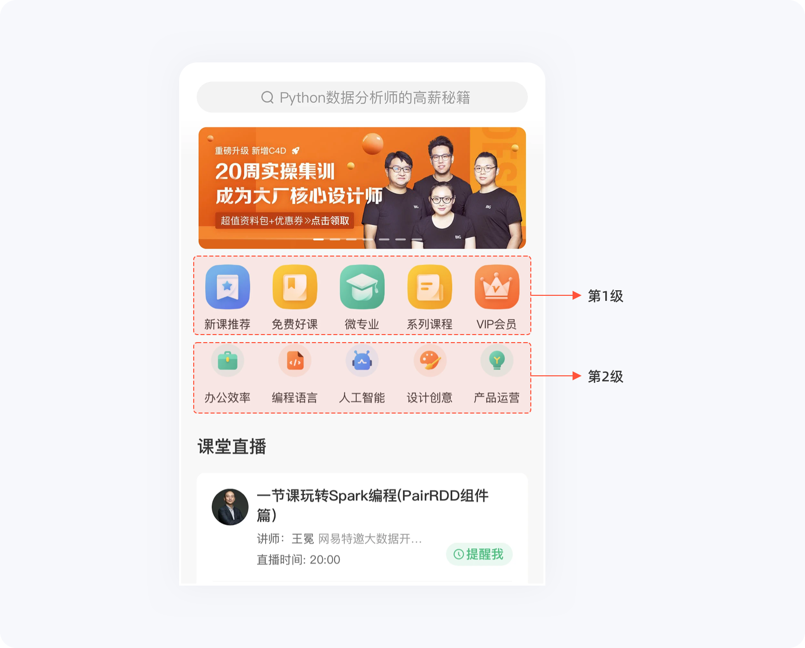在設(shè)計(jì)過(guò)程中,如果沒有對(duì)功能層級(jí)進(jìn)行劃分,一股腦地將所有功能入口平鋪的話,就需要用戶花費(fèi)大量的時(shí)間和精力來(lái)查找需要的功能,無(wú)疑是一場(chǎng)災(zāi)難。我們可以通過(guò)希克定律來(lái)優(yōu)化界面功能布局,根據(jù)業(yè)務(wù)的重要性對(duì)功能入口進(jìn)行分類組合,減少用戶的認(rèn)知及理解成本,以便快速達(dá)到目的。