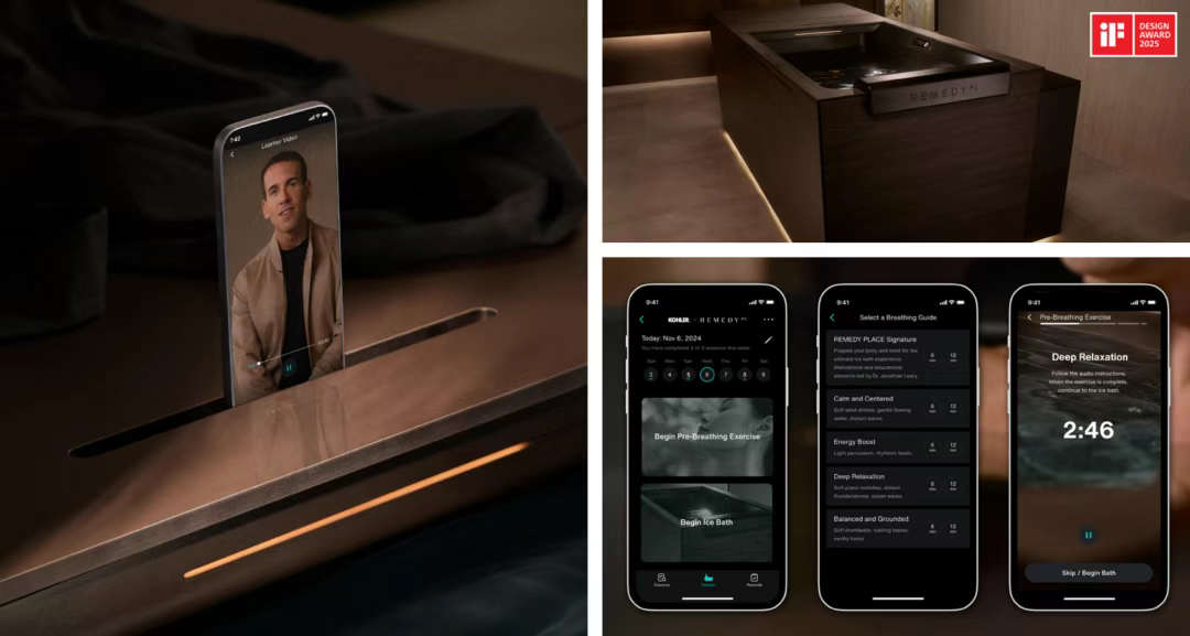 如:這款科勒 x Remedy Place 聯名冰浴桶將醒目設計、優化人機工學和智能科技(Kohler Konnect®)融為一體,提供可定制的冷水浸泡療程,不僅兌現減少炎癥、提升情緒和增強心理韌性的健康承諾,更成為展現優雅健康生活的標志性設計。
