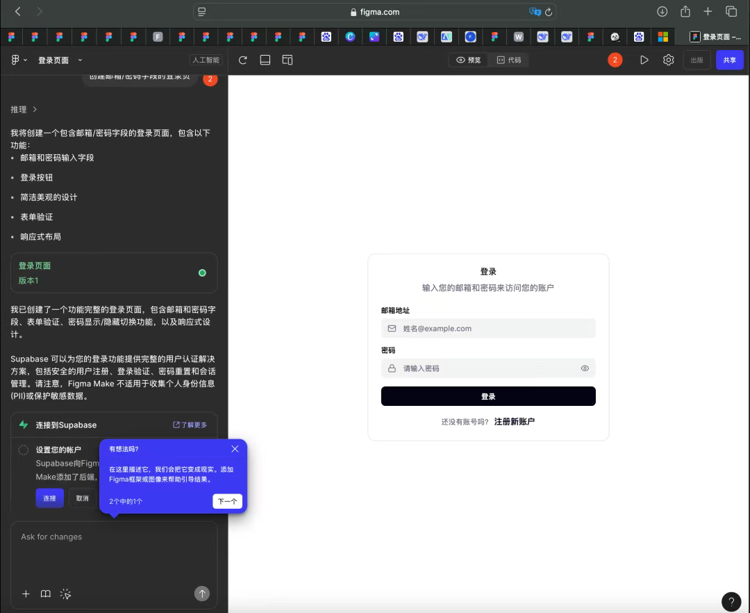 無需編寫 CSS 代碼,輸入指令如“創建帶郵箱/密碼字段的登錄頁”,AI 即刻生成高保真界面及可點擊交互元素。設計構想從概念到屏幕呈現的鏈路被大幅壓縮,省去重復搭建畫布的時間成本。