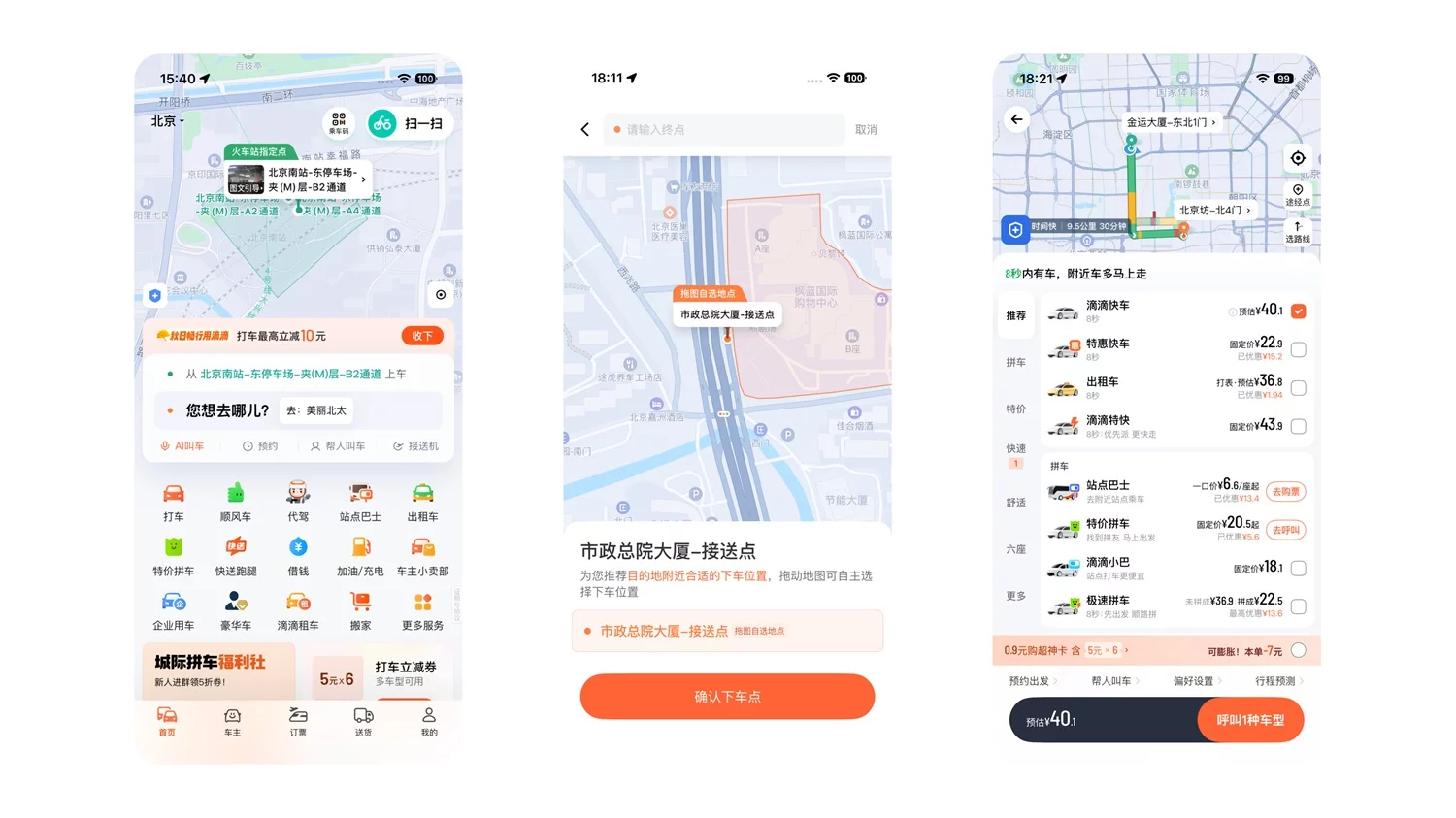 滴滴國內版 則采用“高飽和度、多色彩分區(qū)”策略——橙色代表主叫車業(yè)務、綠色代表拼車、藍色代表巴士服務,同時用不同顏色區(qū)分路況(如紅色擁堵、綠色暢通),通過強烈的色彩對比吸引用戶注意力,貼合國內用戶對“熱鬧感”“明確區(qū)分”的視覺偏好。