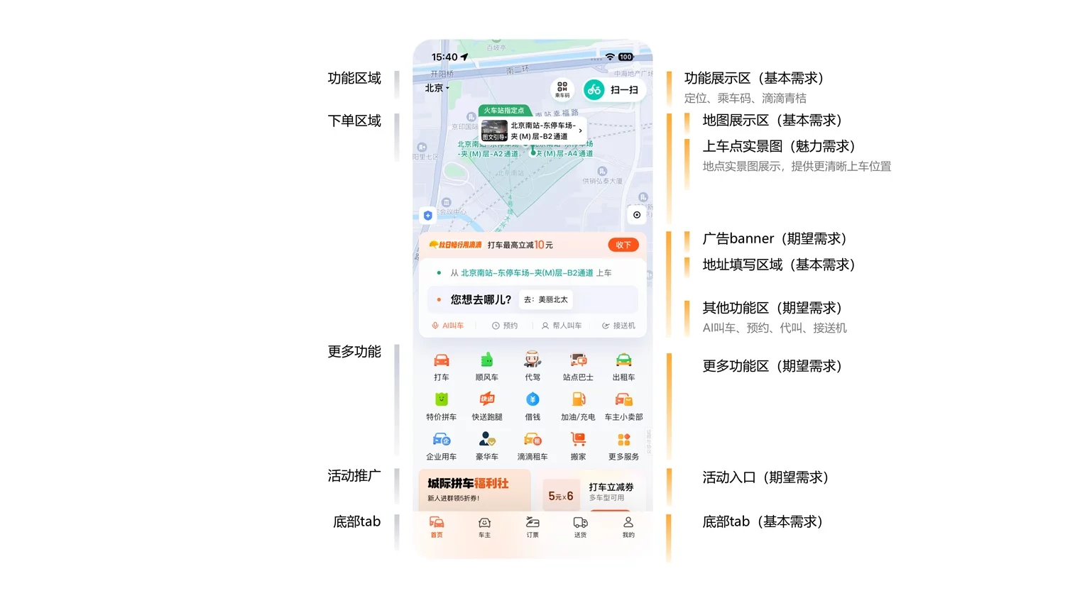 為更清晰對比差異,我對 Uber 和滴滴國內版的首頁進行了區(qū)域劃分: