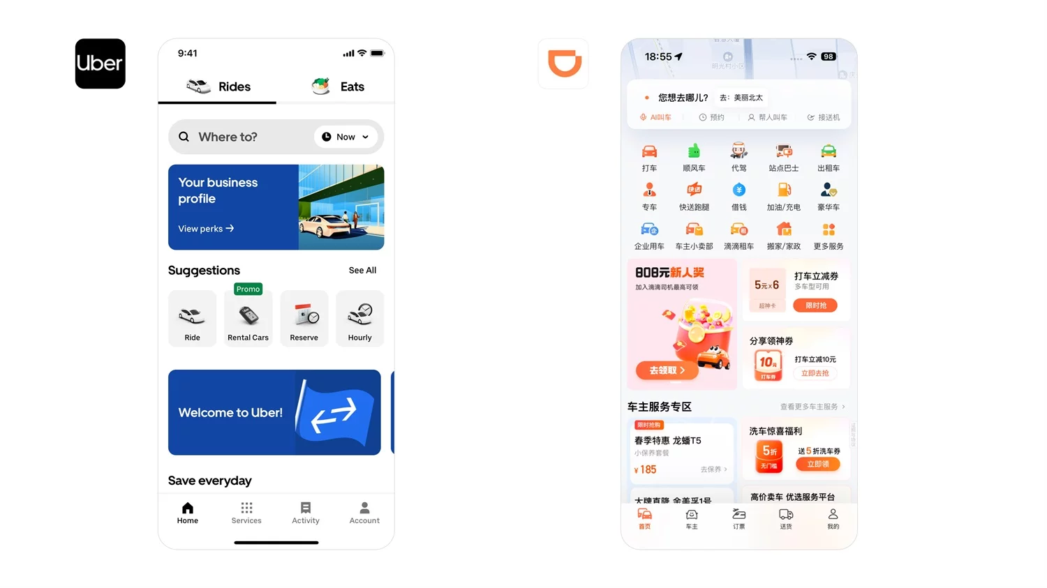 相比之下,滴滴國內版的內容排版信息密度明顯更高:在有限的屏幕空間內,不僅包含叫車功能,還疊加了活動提示、附加服務入口等內容,排版相對緊湊。