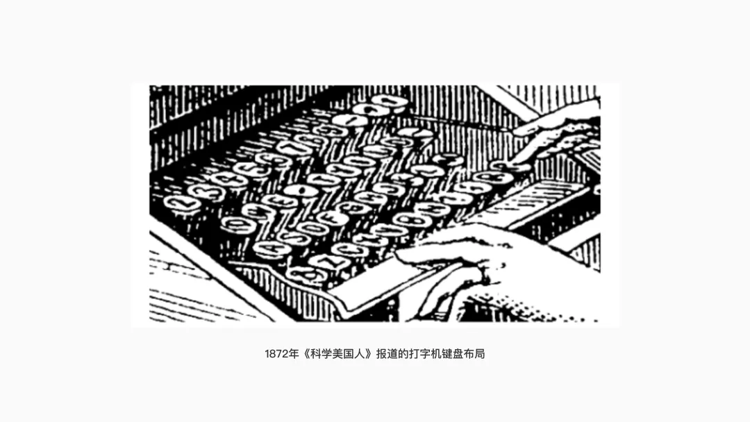在會見了多名客戶后,根據反饋,肖爾斯與其同事對鍵盤的構造與布局進行了多次改進。最終在 1872 年,《科學美國人》在頭版以大幅版畫形式報道了這臺打字機,畫面中清晰展示了其鍵帽結構,此時的打字機已配備 42 個按鍵,包含大寫字母、數字 2 至 9,以及連字符、逗號、句號、問號等常用標點符號。
