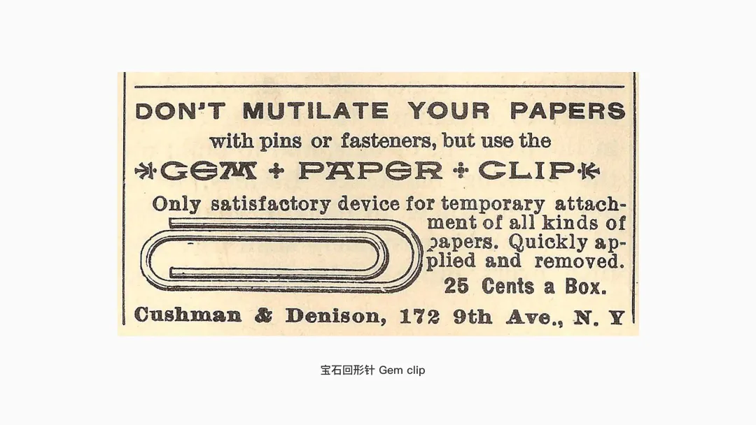 幾年后,喬治·W·麥吉爾(George W McGill)對寶石回形針做出了改良,進一步增大了內環的弧度,使其更明顯地上翹。相比初代寶石回形針平緩的環圈末端,這種上揚的開口形成了更清晰的“示能”——直觀地提示用戶“此處可拉開并插入紙張”。在結構上,它也實現了更省力的開合體驗。正是這一改良版本,逐漸演變成了今天最常見、最廣泛使用的回形針。
