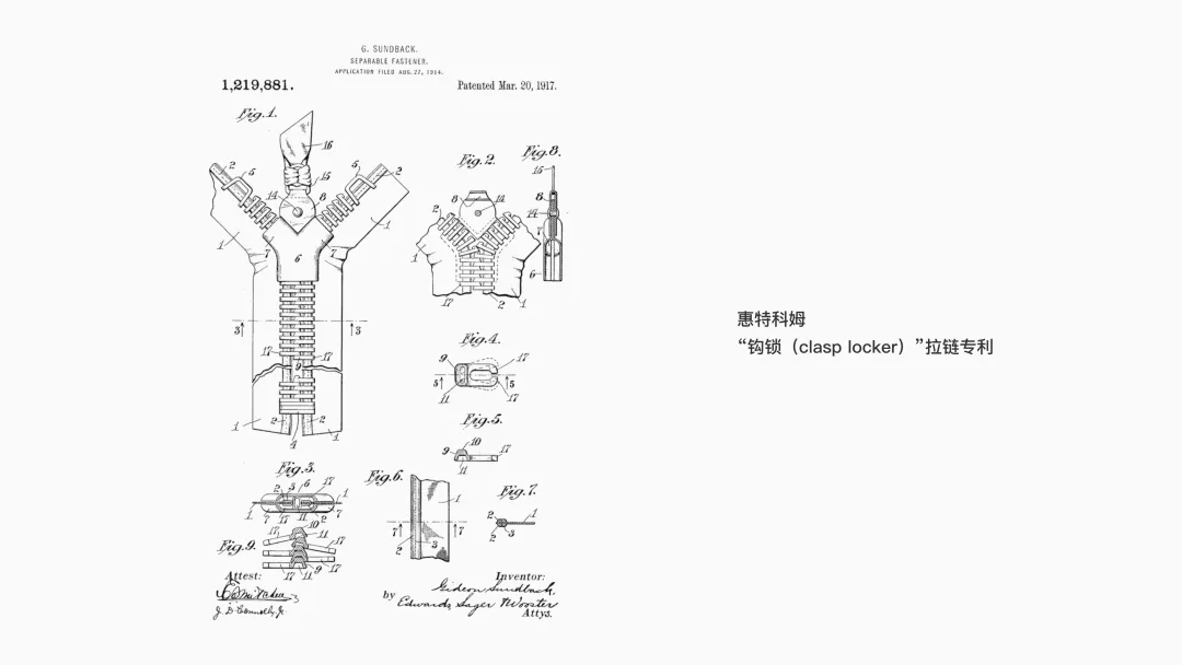 19 世紀末,在追求“效率”的工業時代背景下,拉鏈應運而生。發明家惠特科姆(Whitcomb Judson)想解決傳統的系帶式高幫靴穿脫過于繁瑣這個問題,在芝加哥世界博覽會上展示了名為鉤鎖(clasp locker)的裝置,它的核心目標很明確:用一次滑動,替代逐個系扣的繁瑣過程,節省時間。但當時這種拉鏈依賴手工制作,成本較高,且質量不夠穩定,最終因為結構缺陷及成本問題退出了市場。