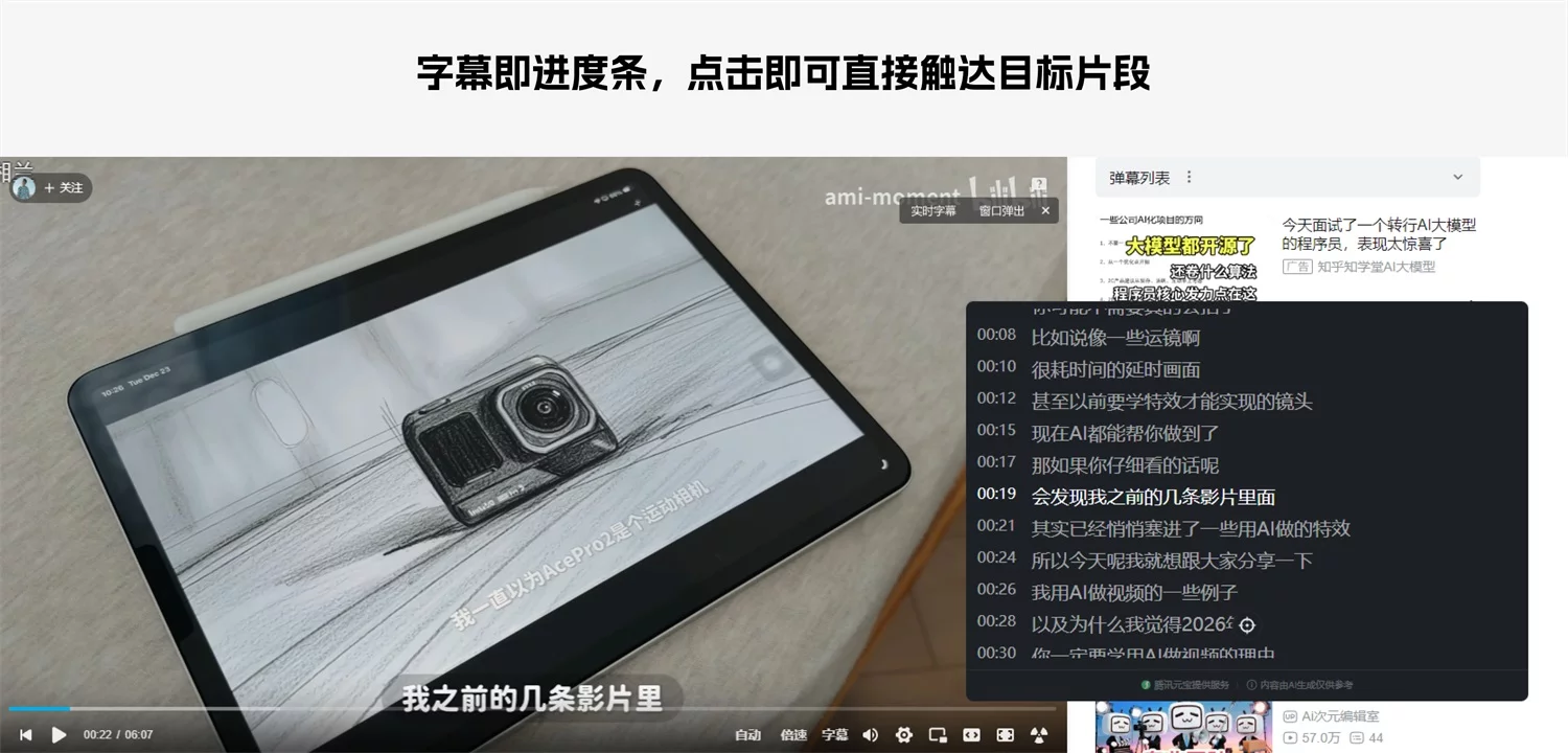 而 AI 播放器中,可以把識(shí)別到的字幕,加入到進(jìn)度條中作為錨點(diǎn),讓用戶根據(jù)具體的字幕內(nèi)容,就可以精準(zhǔn)定位并直達(dá)該進(jìn)度點(diǎn),找片段的效率大大提升,直接使體驗(yàn)升維。