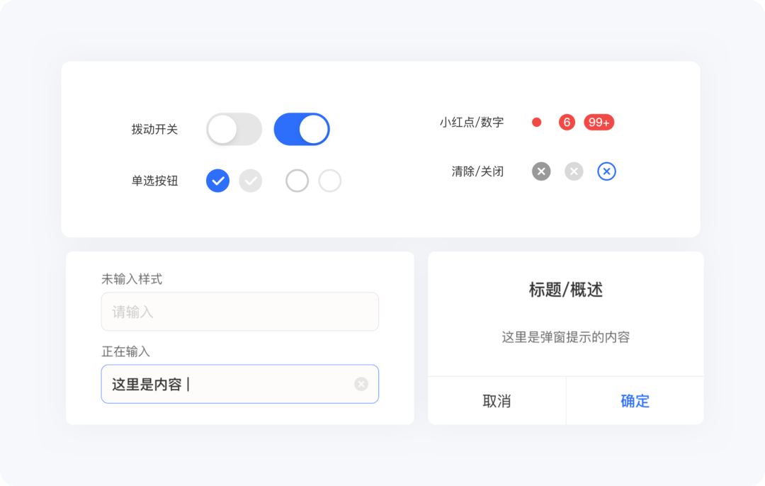 當完成基礎的形狀、文字、顏色、尺寸、間距等規范確定后,進行基礎元素的組合即可得到規范的組件。
