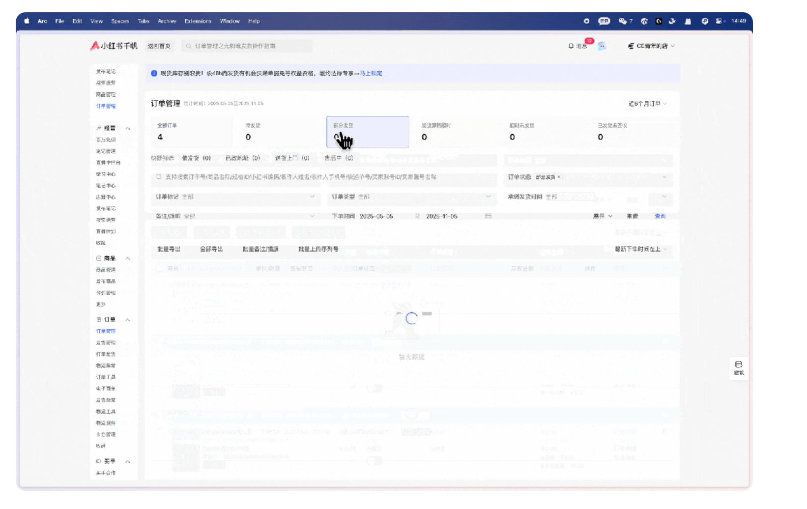 比如我想外露的內容是各種狀態,我就可以將其放在頂部,進行指標圖+篩選功能的雜糅,像在小紅書千帆系統當中,對于訂單的多種狀態,就會使用這一技巧,進行呈現。