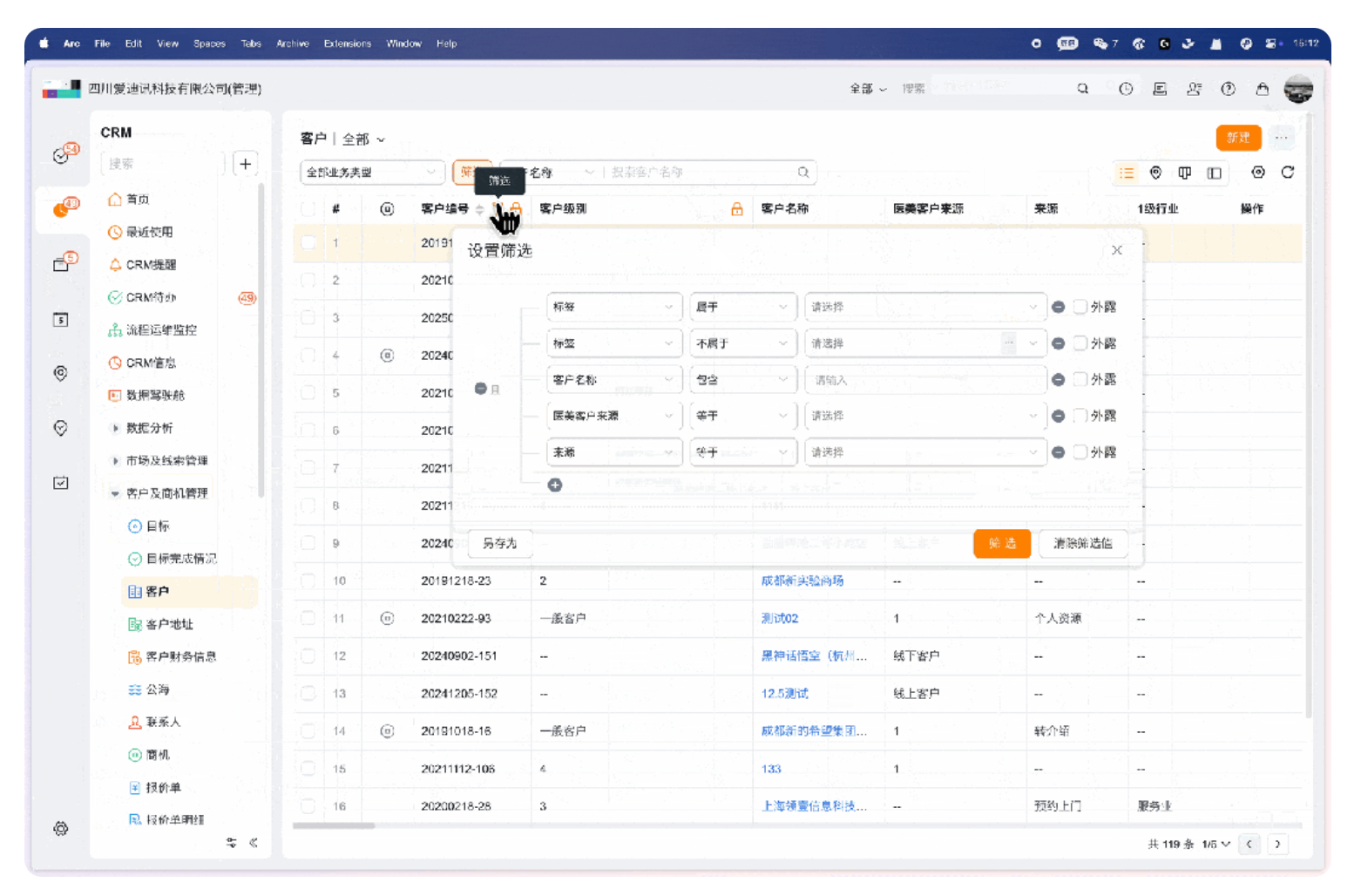 比如下面這三個篩選項,所計算的呈現規則就是 「銷售負責人是李強」且「銷售時間是 近一個月」且「價值為高價值」的客戶,這樣就是一個典型的且的關系。