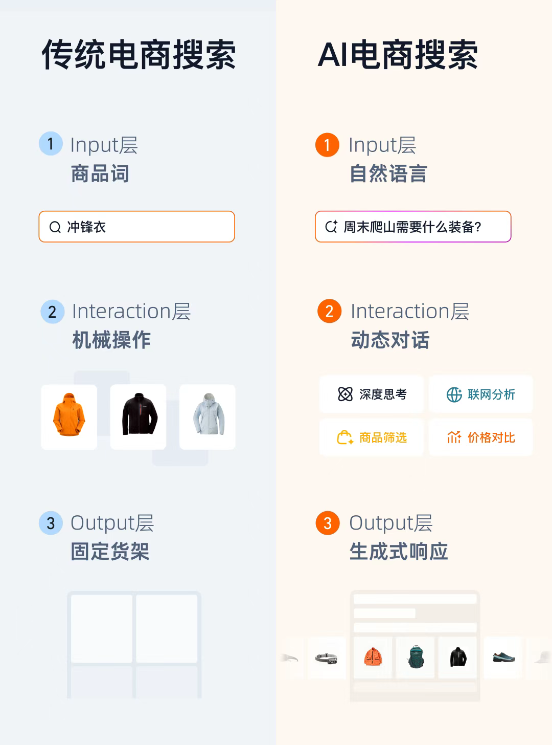 在傳統電商搜索體驗中,用戶將需求轉化為關鍵詞組合,系統執行商品庫檢索并返回貨架式的結果給到用戶篩選對比,形成"用戶輸入-系統生產-固定響應"的循環。