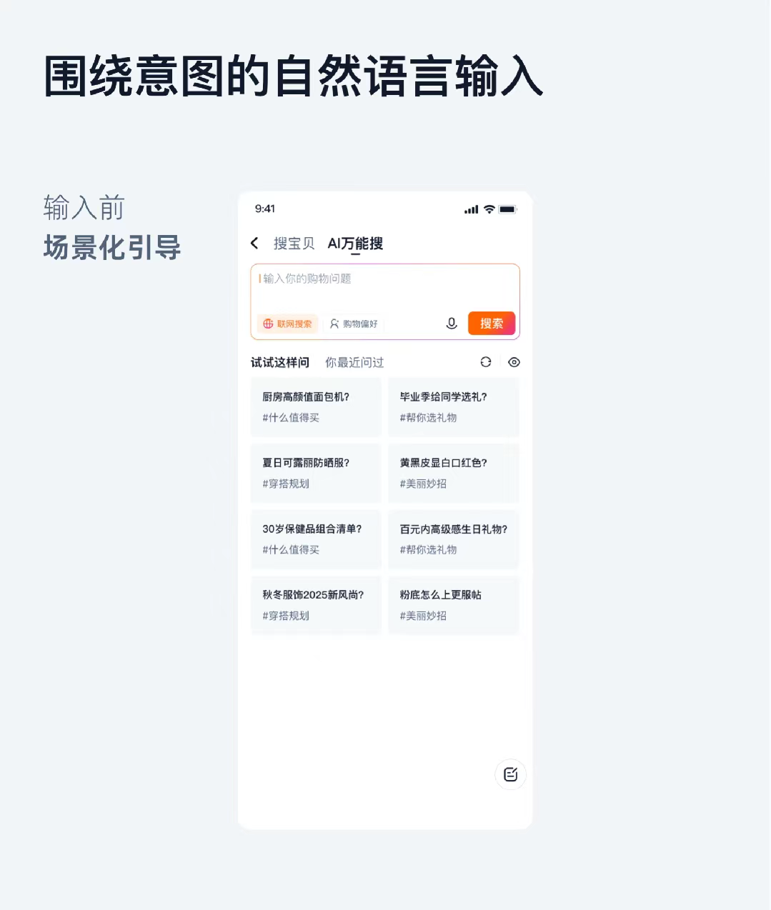 用戶需求是模糊、動態且高度個體化的,因此在動態功能區中,我們保留了電商最原始的AI基因,并將其外化為搜索框動態功能區的“購物偏好”的調節能力。