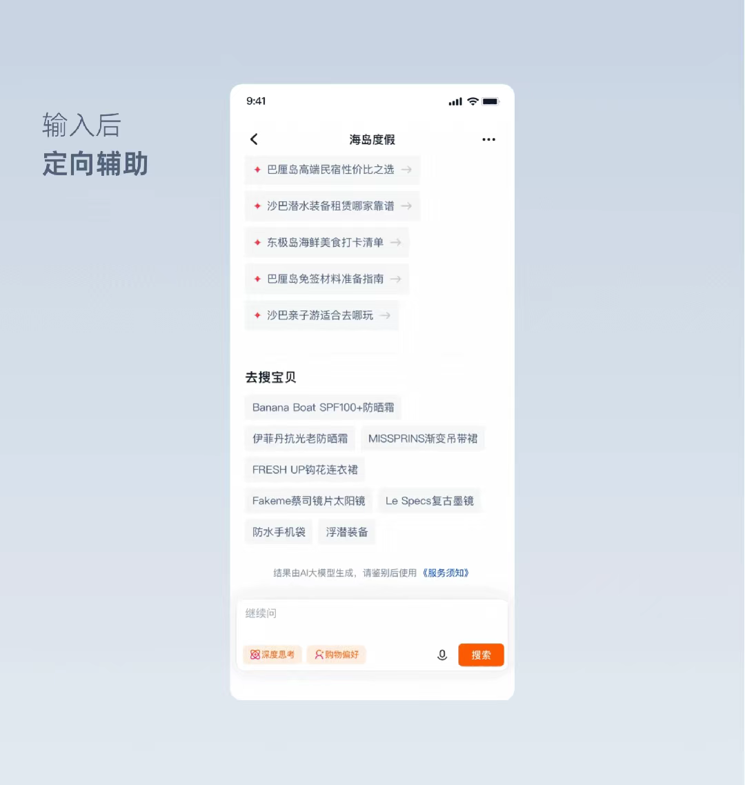 AI萬能搜激活頁,是智能預設后的意圖觸發器,沿用用戶最熟悉的傳統搜索形態的同時,通過整個頁面的場景化引導,鼓勵用戶進行自然語句的混合輸入;