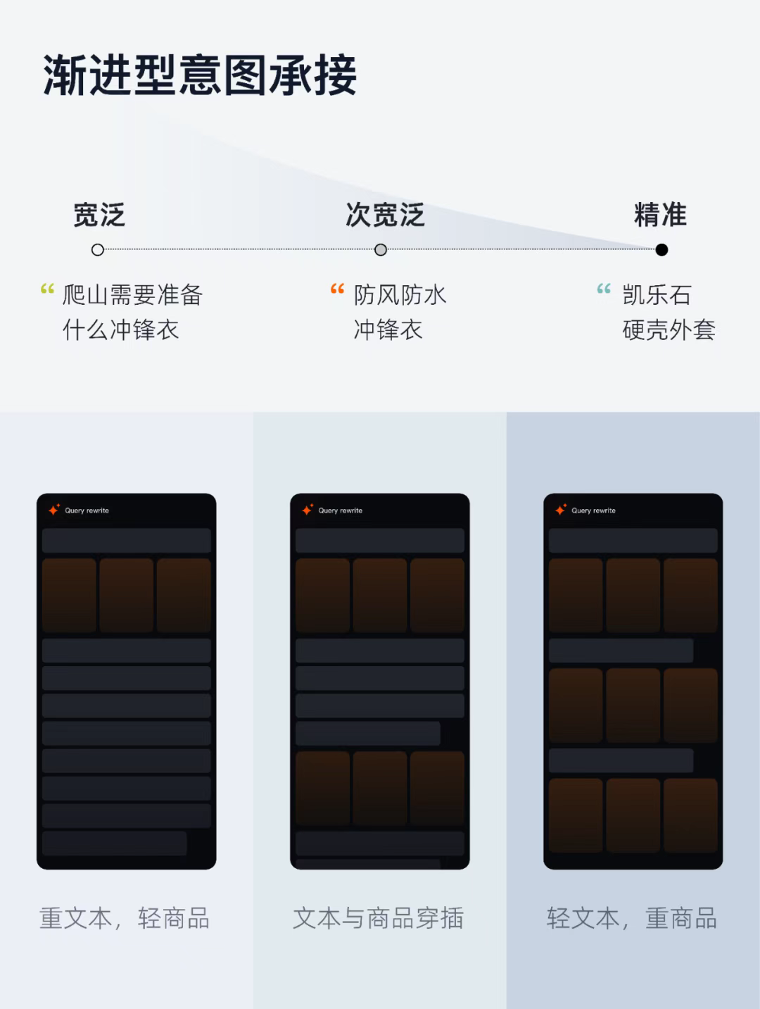 不同于其他AI產品,用戶在淘寶搜索場景的核心仍然是商品,因此文字的密度與組織、文字與商品的穿插節奏尤為重要,需要設計師把握用戶意圖和需求與業務特點,定義基礎范式反向約束調控AI。