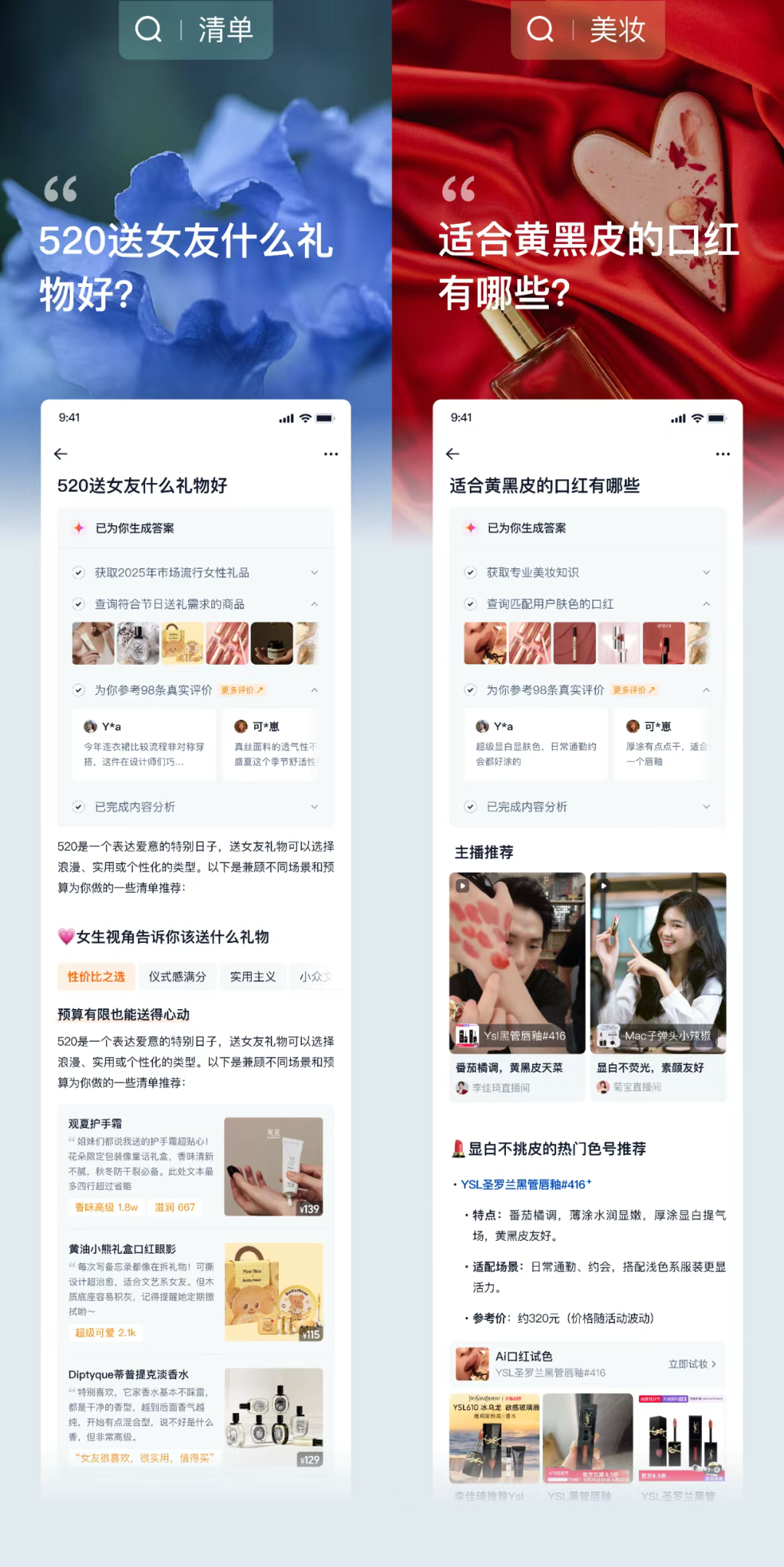 場景層動態適配:針對特定的場景行為特征和決策邏輯,進行需求細化和設計策略的分化,比如送禮意圖下,通過清單式結構+場景標簽,將抽象需求轉化為可操作的推薦路徑,依賴用戶畫像與場景識別能力,實現“從模糊場景到精準決策”的躍遷;