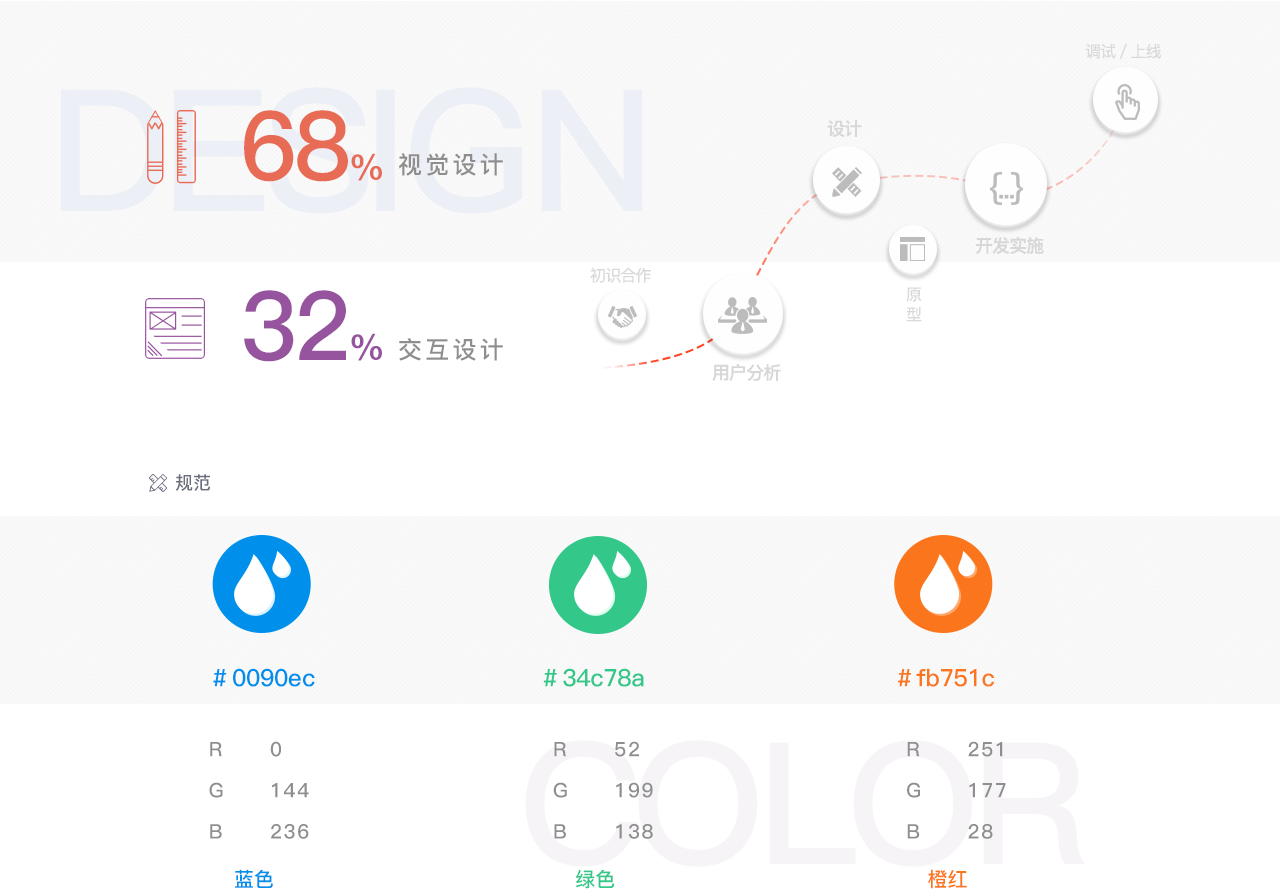 整體顏色以深藍色為底搭配藍、綠、橙紅、紅等亮色使用這樣的顏色組合,藍色為水的顏色同時為自來水集團Vl標準色配合綠黃使用相互互補,同時藍綠與橙綠分別是相鄰色而黃色與藍色又互為互補色,能在設計中起到關鍵信息點、事件強烈對比作用,以吸引用戶的注意