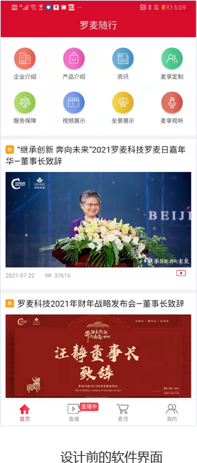 羅麥隨行app,一個與羅麥伙伴無縫鏈接的平臺,這是一個讓羅麥伙伴足不出戶,也能隨時隨地了解羅麥事業的平臺。羅麥微生活、羅麥微視頻、羅麥隨身工具包、羅麥電子書、羅麥科技微聚焦等版塊統統搬回家。這個App已上線多年未更新,客戶希望設計公司自由發揮,在現有功能上優化交互和視覺,完成首頁改版。