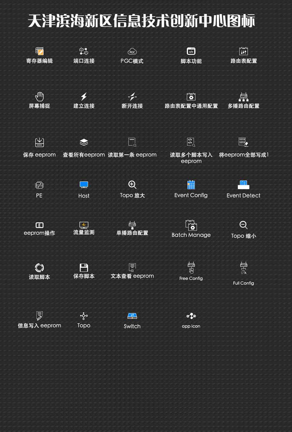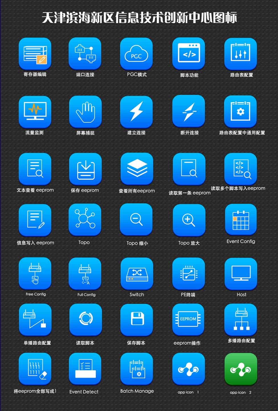蘇野芯片高速串行rapidio芯片配置軟件是一款芯片功能監(jiān)測,配置及調(diào)試的軟件,其復雜程度高,專業(yè)性極強,需要反復與客戶溝通,理解背后含義才能設(shè)計出符合產(chǎn)品特征的圖標。